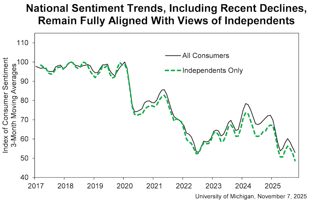 Fed policy remains the other key variable: Polymarket now shows 72% odds of a 25 bps December cut and 27% odds of no change, slightly more dovish than the 60-65% priced into rates markets. Still, Friday’s consumer sentiment slumped to 50.3, near three-and-a-half‑year lows, with the shutdown cited as a key driver.