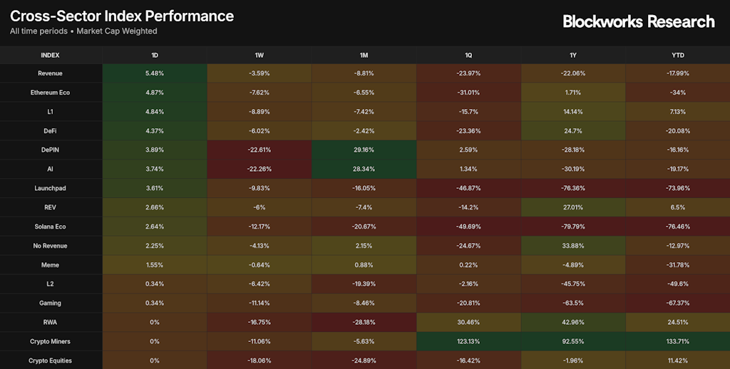 In crypto, Revenue tokens led gains yesterday (+5.48%), driven by strength in Ethereum Eco (+4.8%) and DeFi (+4.3%), while L1s (+4.8%) also posted solid advances. BTC bounced +2.2% after testing the $100,000 level, providing a tailwind across sectors. The only laggards were Gaming (-2.7%) and Modular Infrastructure (-2.6%), which saw profit-taking after recent outperformance.