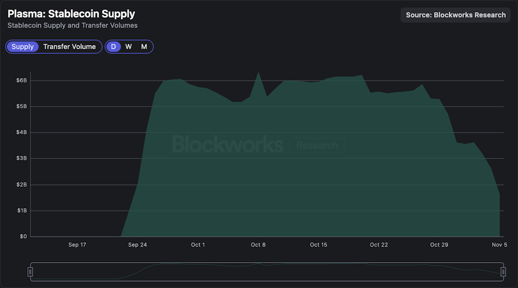 Plasma DeFi continues to struggle with outflows. The week of Nov. 3-7 saw -$2.5 billion exit the ecosystem, slightly higher than the previous week’s -$2.3 billion.