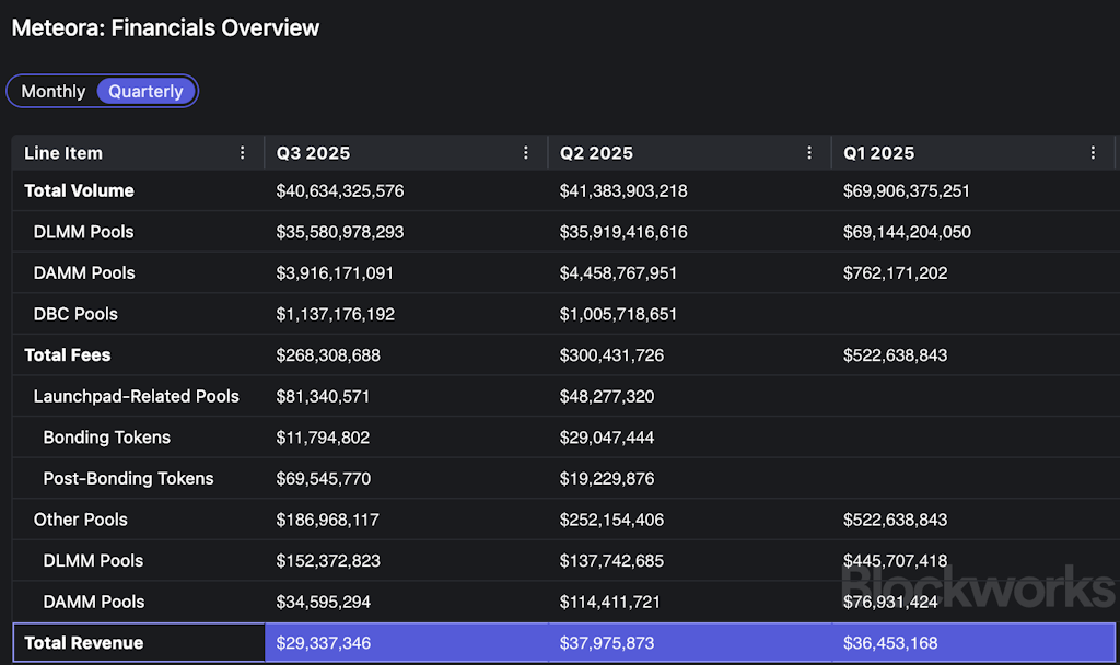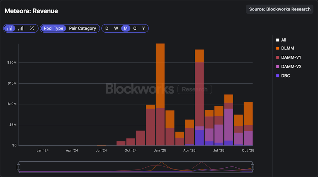 On Solana, Meteora continued to post robust revenue numbers, generating $10.4 million in October. While memecoin infrastructure is considered highly cyclical by investors, therefore deserving of discounted valuations, Meteora’s non-memecoin revenue hit an all-time high of $1.38 million in October, nearly doubling September’s $751,000. Memecoins still dominate overall revenue due to their high take rate: Meteora earns 0.16% on memecoin swaps vs. 0.005% on stablecoin swaps, meaning the protocol needs $32 of volume from majors to match $1 of memecoin revenue.