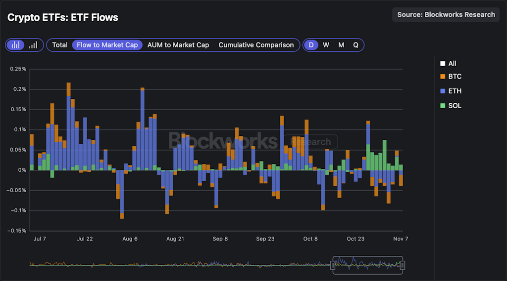 Finally, when looking at ETF flows, Solana stands out as the only asset with consistent inflows in the previous week. While volumes decreased from the standout Oct. 27 to Nov. 2 period ($199 million), Solana showed significant strength when adjusting for market cap: ETF flows through October have accumulated 0.263% of supply, vs. BTC’s 0.133% and ETH’s 0.0818%.
