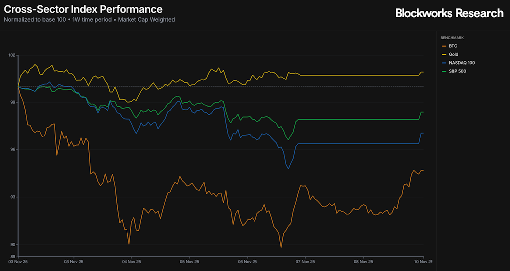 Risk assets caught a bid after the Senate advanced a bipartisan funding package to end the record-long government shutdown. Polymarket odds now show an 87% chance the shutdown ends by Nov. 15, which would restore critical data flow after two straight months of jobs and CPI blackouts. The news was particularly welcome for BTC, which had been struggling around the $100,000 mark all week and was down -10% before bouncing on the headlines. While the bill still needs House approval and Trump’s signature, markets are taking the procedural progress as the main risk-on catalyst, lifting global equities and futures.