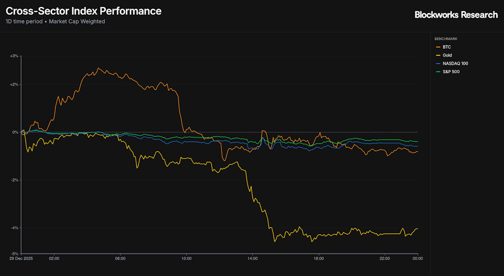 Markets kicked off the final week of the year on a softer note. Bitcoin (-0.81%) underperformed its US equity benchmarks, with the Nasdaq (-0.59%) and S&P 500 (-0.39%) posting modest pullbacks after tech stocks drove the S&P 500 to all-time highs last week. Meanwhile, Gold (-4.04%) and other precious metals saw a sharp selloff amid profit-taking, after having been standout performers in the past few weeks.
