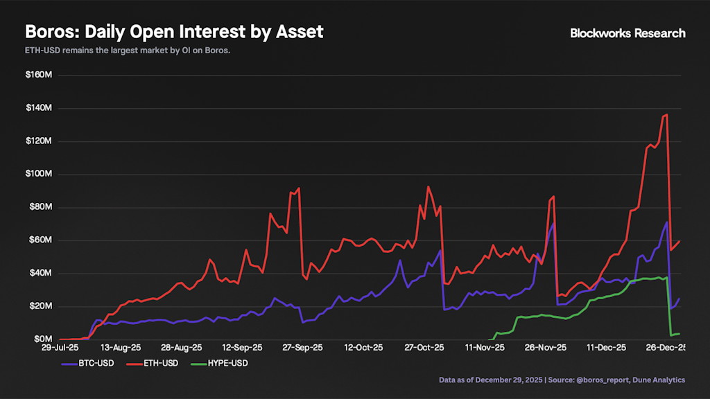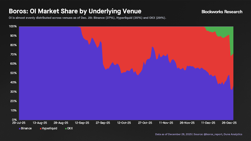 While the bull case for Boros is that it becomes DeFi’s default interest rate derivatives venue (extending beyond funding rates to stablecoin yields, money market rates, LST yields and more), its largest opportunity over the next six to twelve months is squarely in the perpetuals vertical. Boros launched with only BTCUSDT and ETHUSDT perps markets on Binance in August, but has since expanded to additional venues (Hyperliquid and OKX) and assets (HYPE). The chart below shows that OI was dominated by Binance early on, but is now almost evenly distributed across venues as of Dec. 29: Binance (37%), Hyperliquid (35%), and OKX (29%).