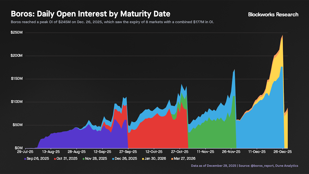 Although Boros has rolled out gradually, early traction has been strong. As shown in the chart below, daily open interest (OI) by maturity peaked at $245 million on Dec. 26, 2025, when eight markets with a combined $177 million in OI expired. The growth pattern in OI is highly cyclical, much like Pendle v2, reflecting the natural peaks and troughs around the maturities and redemptions inherent to yield markets.