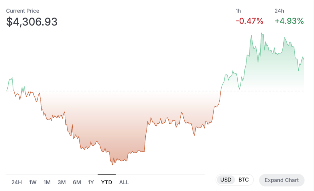 Ether, which dipped to ~$3,800 last week, climbed above $4,300 today (12% off its all-time high). Though the asset has grown 30% so far in 2025, ETH has not, on average, seen the gains BTC has in October (+4.7% vs. BTC’s +20.4%).
