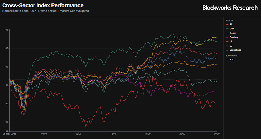 Within crypto, DePIN and DeFi led the recovery, climbing 6.7% and 6.1%, on the day. The DePIN index was boosted by HNT and Render, up 11.1% and 8.7%, respectively, together accounting for roughly a quarter of the index.