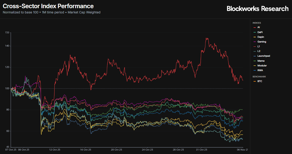 One clear standout has been the AI sector, which is up 7.3% — not just since the Oct. 10 correction but through the recent market weakness as well. Gains from tokens like ICP, up 31.8%, and VIRTUALS, up 18.5%, have helped, but much of the sector’s momentum continues to come from TAO, which makes up a third of the index and is up 10.8% this month.