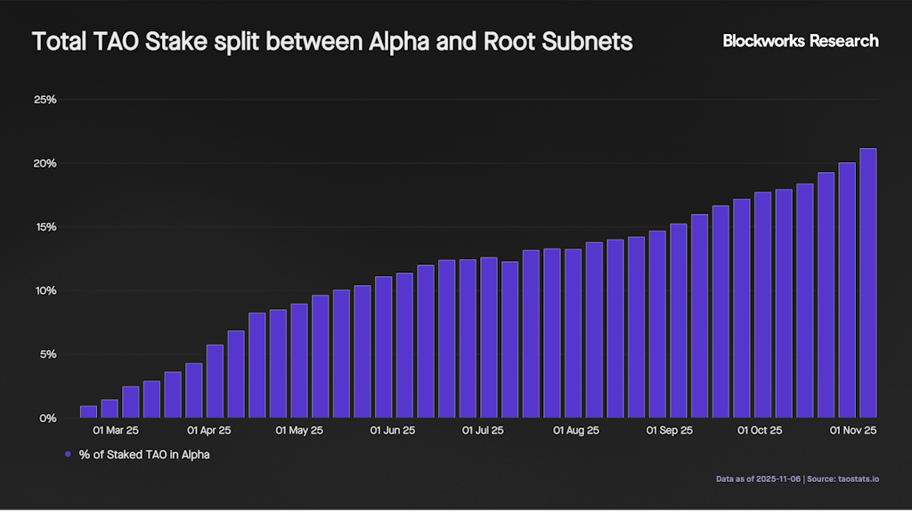 The stake split between Alpha and Root subnets continues to grow as well, from 13.2% in July to 21.1% today, showing growing interest in Bittensor Subnets.