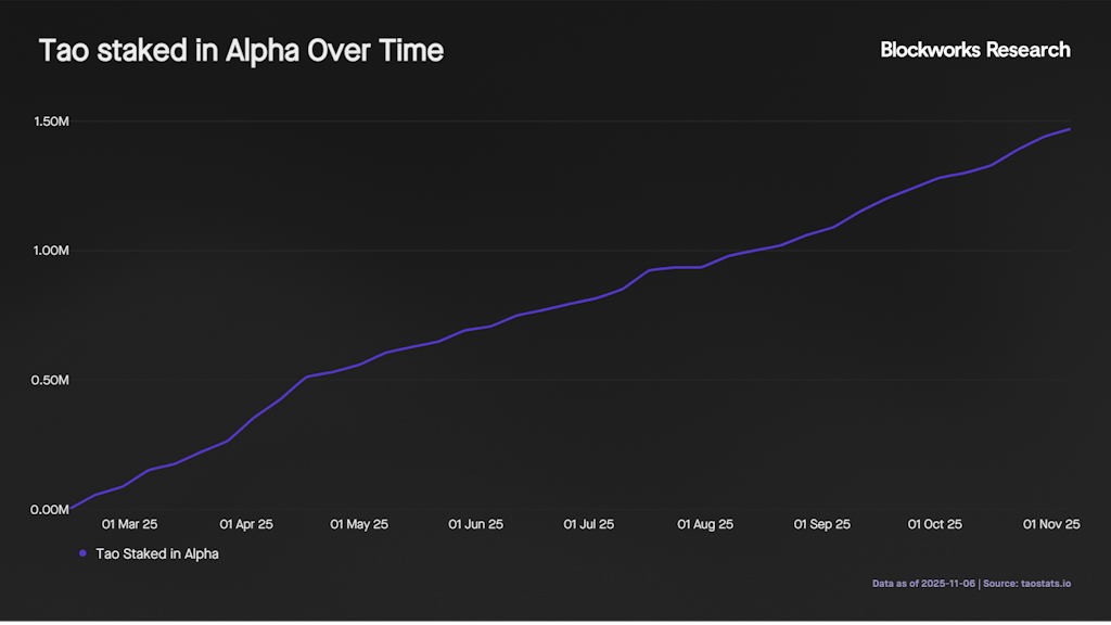 The amount of TAO staked in Alpha continues to climb, signaling rising demand for subnet tokens.