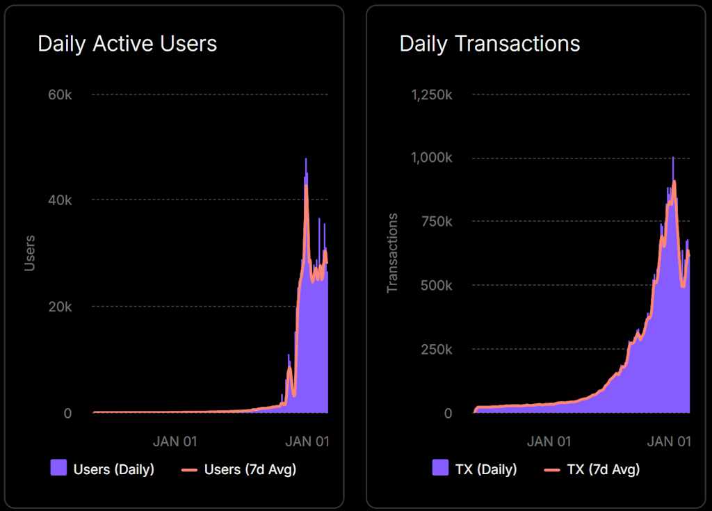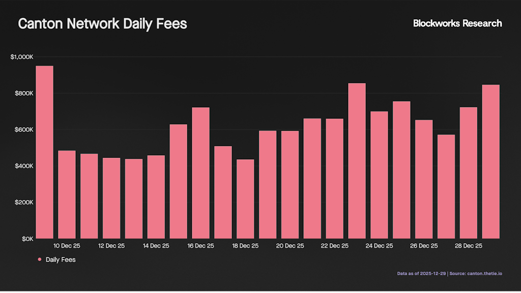 Usage metrics complete the picture. Since November, Canton has averaged around 28,500 daily active users and 678,300 daily transactions, putting it in line with networks like Monad on DAUs and Ton on transaction count.