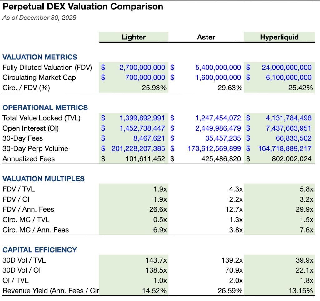 On comps, the market is valuing Lighter similarly to Hyperliquid. At $2.7 billion FDV and $700 million circulating, Lighter’s float is ~25.9%, nearly identical to Hyperliquid’s ~25.4% ($24 billion FDV and $6.1 billion circulating). More importantly, Lighter is trading on a fees multiple that is already in Hyperliquid’s range: 26.6x FDV/annualized fees (and 6.9x circulating/annualized fees) vs. Hyperliquid at 29.9x (and 7.6x). That’s despite a large gap in absolute scale, Lighter printed $8.5 million in 30D fees vs. Hyperliquid’s $66.8 million, and Lighter’s open interest is $1.45 billion vs. $7.44 billion for Hyperliquid.