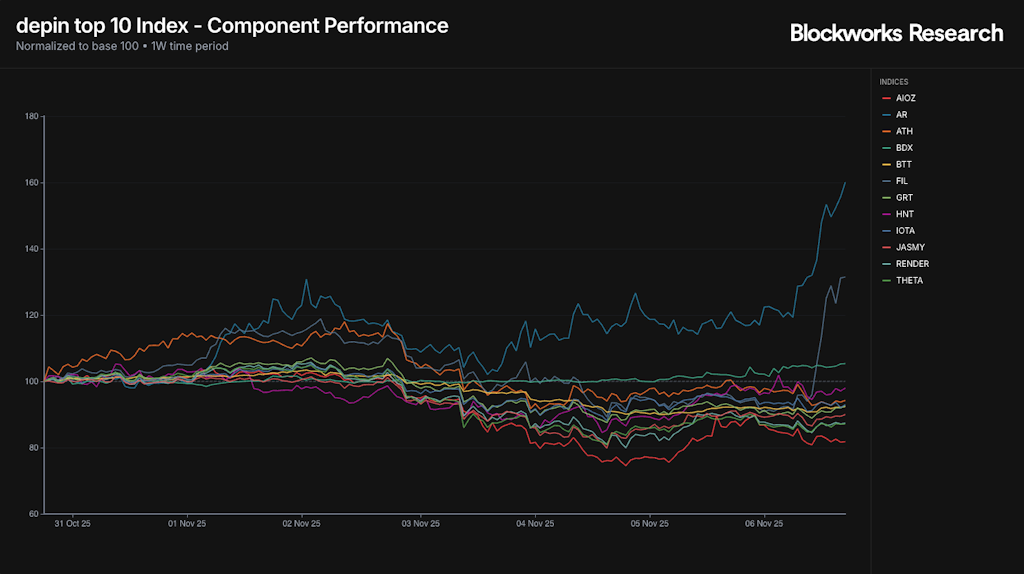 Weakness prevails across the board, with all of our tracked indices posting negative returns over the past week, except for DePIN. This weakness comes as the majors BTC, ETH and SOL have established a daily and weekly downtrend, while equity indices have reversed ~3%-5% off their highs, adding risk back to the market. The selloff in equities has elevated the VIX to a level of 20.