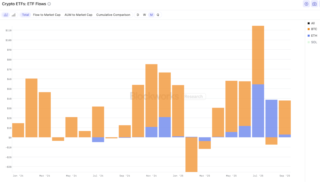 Spot bitcoin ETF inflows rebounded in September after the products bled $750 million in August. Though ether ETFs had stolen the show in August, capital flowing to those funds slowed mightily last month.
