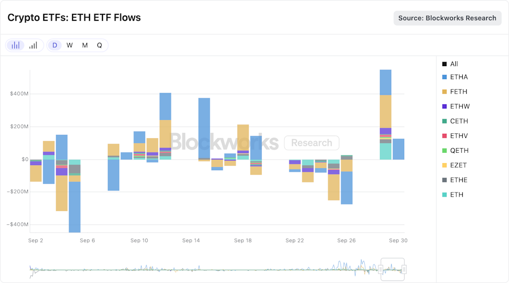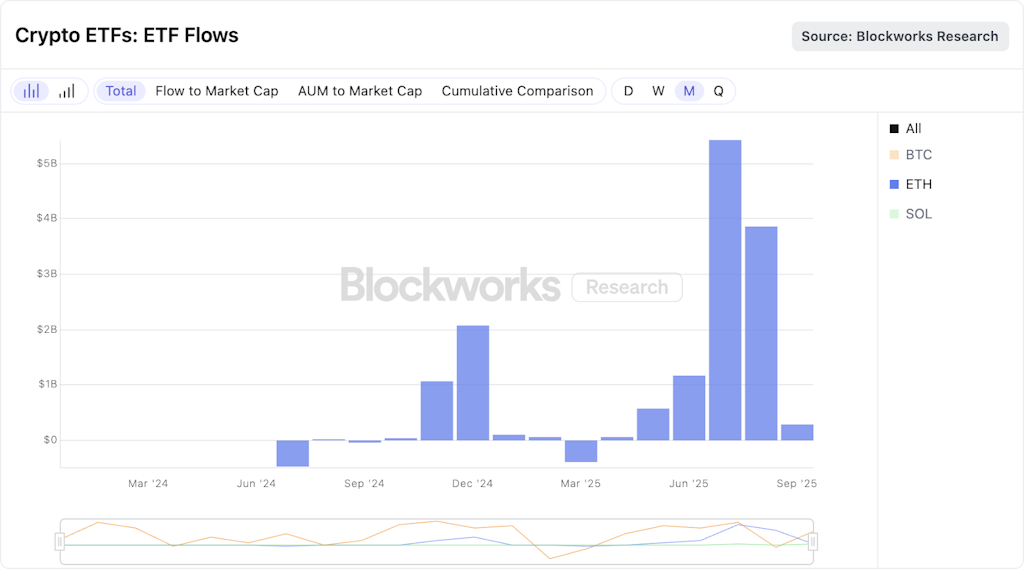 Ethereum ETFs recorded a dramatic slowdown in September, with monthly inflows collapsing from $3.9 billion in August to just $285 million, according to Blockworks Research data.