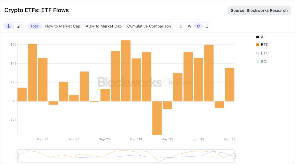 Bitcoin ETFs, meanwhile, continued to draw heavier absolute flows and with more resilience relative to ether. The BTC ETFs rebounded to $3.5 billion net inflows in September. Despite a weak final week, creations earlier in the month more than offset redemptions.