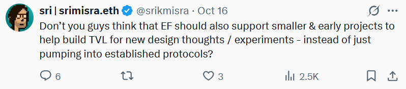 You could imagine a world where the EF tries to be “fair.” It allocates capital to smaller projects, but that exposes the foundation to a wider range of smart contract/security risks.
