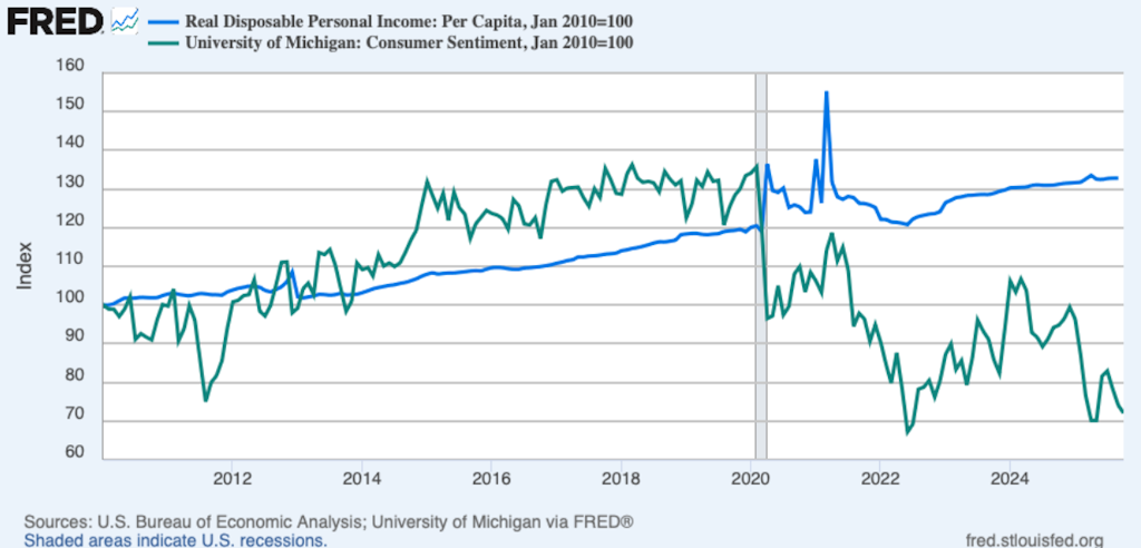 Starting with the pandemic, consumer sentiment (in green) decoupled from real disposable income (blue) and has never recovered. More than ever, people are more pessimistic than the data suggests they should be.