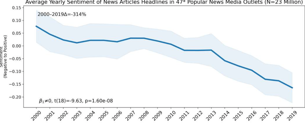 In 2022, an academic study found “a pattern of increasing negative sentiment in headlines.” Specifically, headlines in 2019 were found to be 314% more likely to reflect anger, disgust, fear or sadness compared to 2000.