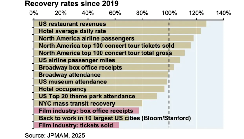 JPMorgan finds that things like restaurants and air travel have fully recovered from the pandemic, but the film industry and mass transit have not.