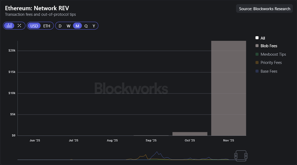 Post-Pectra, between June and October, Ethereum generated around $900 in blob fees. The brief spike in November brought this to ~$23,000. Still not material, but it highlighted the order-of-magnitude difference when blobs actually have a market.