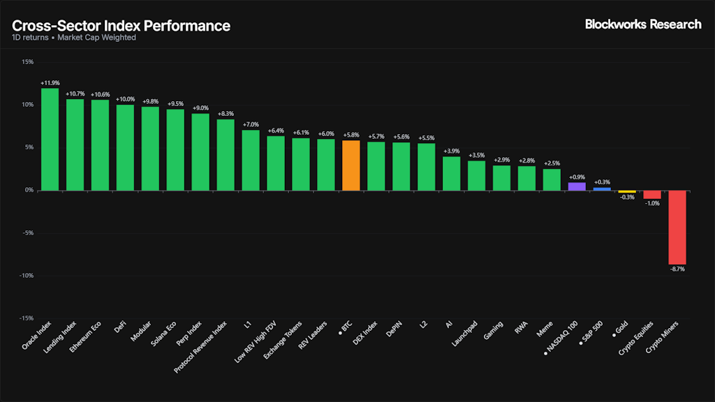 The crypto sector breadth was exceptionally strong. Oracles, lending and the broader Ethereum ecosystem led the board, signaling a clear rotation back into core infrastructure and high-utilization protocols. DeFi, Modular, the Solana ecosystem, and perps followed close behind with similarly solid showings, pointing to broad appetite for beta across liquid alt sectors. Lower down the stack, L2s, AI plays, launchpads and gaming tokens all moved higher, while more speculative areas like memes lagged. The only clear pockets of weakness were crypto equities and miners especially, which saw meaningful pullbacks.