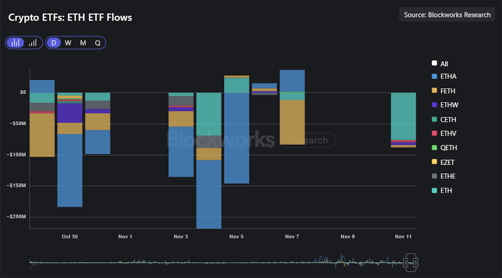 Meanwhile, ETH ETFs remain under pressure, with intermittent inflows failing to offset steady redemptions from major issuers. The latest data show ETH ETF flows leaning negative into mid-November. The result is a choppy flow profile that underscores weaker conviction in the ETH trade relative to BTC. ETH’s muted price performance hasn’t helped either; it continues to trail BTC both in spot and derivative markets. Funding rates remain flat, and the futures curve is showing less optimism compared to earlier in Q4, suggesting limited appetite for leveraged exposure.