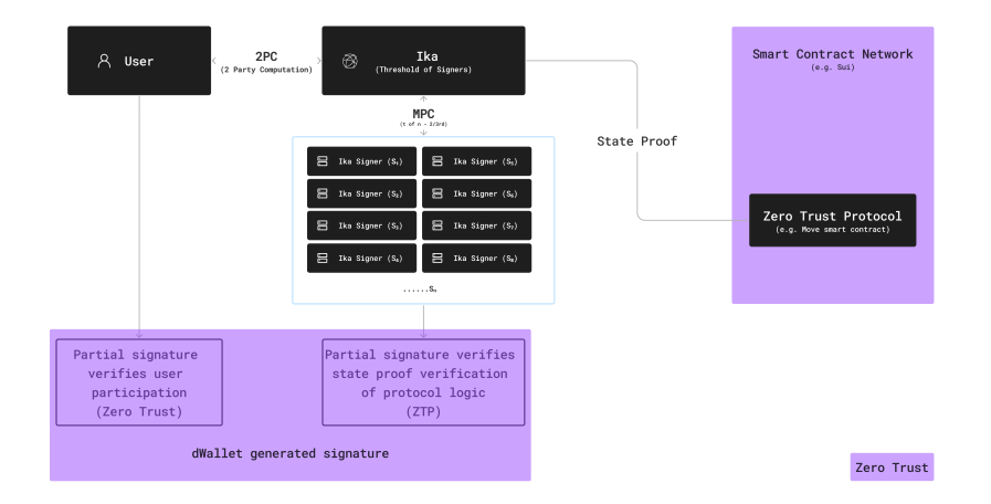 The protocol’s novel 2PC-MPC architecture enables distributed networks to generate signatures with cryptographic guarantees that require user participation, solving a critical limitation in existing threshold signature schemes. While competitors like Lit Protocol, NEAR and ICP offer threshold signatures controlled by permissioned validator sets, Ika can ensure no transaction can execute without explicit user authorization, eliminating risks from compromised validators or rogue employees.