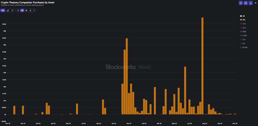 That skepticism is showing up in the data. BTC purchases by treasury companies have slowed dramatically, down from billion-dollar waves every few weeks to more modest weekly buys of $25 million-$50 million recently.