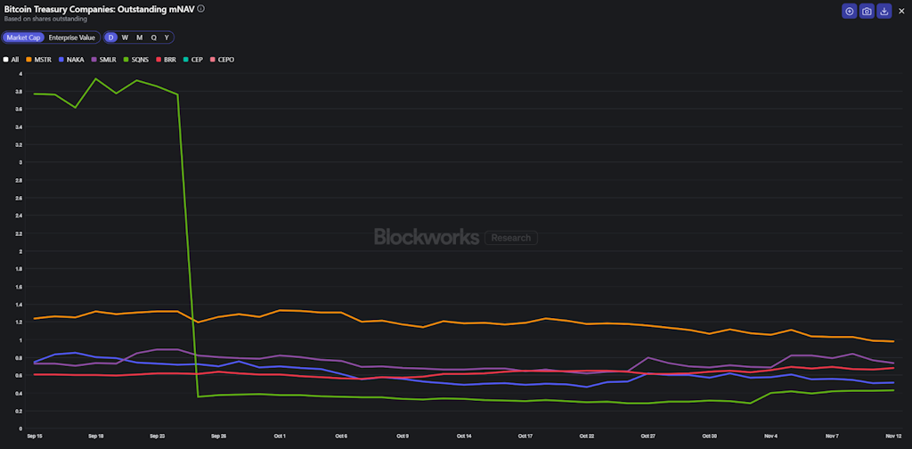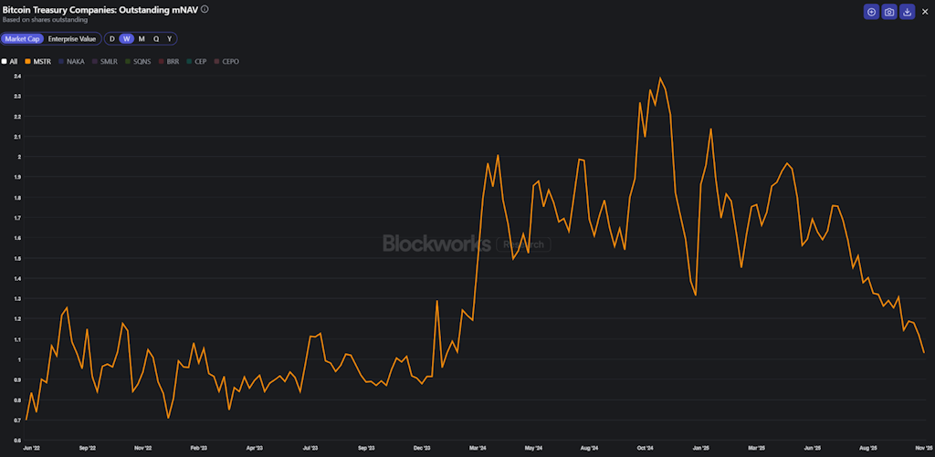 Doubts are starting to build around the sustainability of treasury companies now that the original pioneer of this playbook, Strategy (formerly MicroStrategy), is trading below an mNAV of 1 for the first time since early 2024. The company’s mNAV multiple has steadily bled lower from a peak of 2.4 following Trump’s election win.