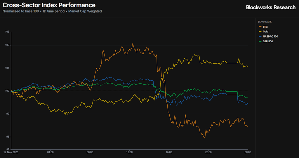 Markets slid again despite the optimism that started the week, with the S&P 500 down -0.27%, the Nasdaq down -0.55%, and BTC lower by -1.54%. The flight to safety trend continued, with Gold climbing 1.08% on the day.