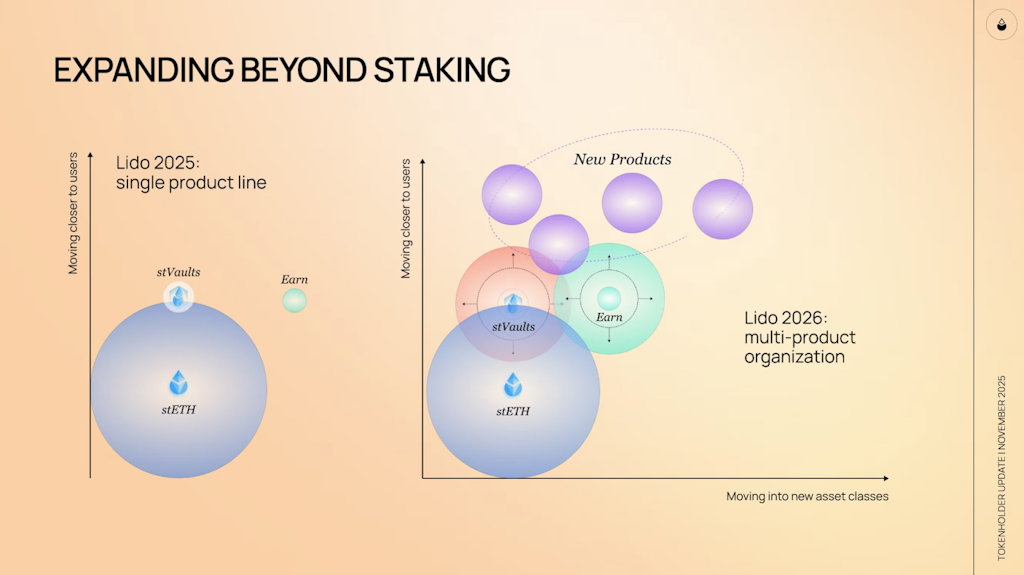 This sets the stage for Expanding Beyond Staking, where Lido evolves from a single-product stETH protocol in 2025 into a multi-product organization in 2026. Lido’s stVaults become the configurable chassis for institutional staking and yield strategies, Earn expands as the simple “default yield” front door for retail and exchanges, and a new tier of structured and automated products sits on top as Lido moves both closer to users (distribution) and rightward into new asset classes.