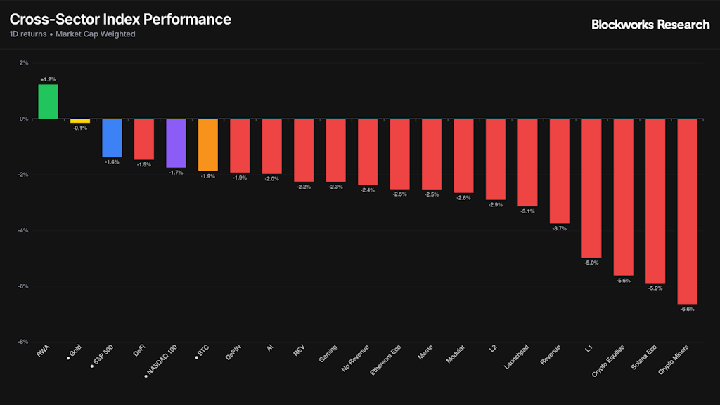 Finally, regarding cross-sector performance, every crypto index we track was negative on the day, with the sole exception of RWA (+1.2%). The worst-performing indices were Crypto Miners (-6.6%), Solana Eco (-5.9%), and Crypto Equities (-5.8%). The fact that two of the worst-performing indices were equities is a further indication of broader risk-off sentiment driven by macro concerns.