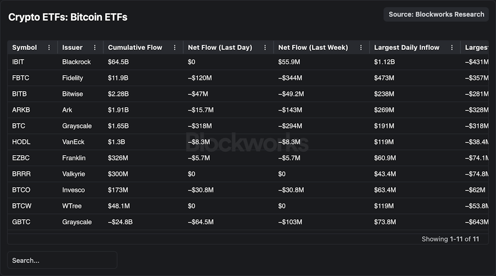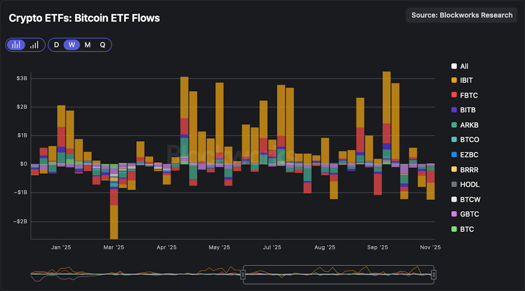 Bitcoin has been hit especially hard by recent macro uncertainty, with bitcoin ETFs experiencing their second-worst day ever, in terms of net flows, yesterday. Bitcoin ETFs saw almost $870 million in outflows, suggesting that we’ll close the third consecutive week with negative flows. The last time bitcoin ETFs experienced three or more consecutive weeks of outflows was between February and March of this year, with BTC dropping below $80,000. The chart below shows bitcoin’s weekly ETF flows by product, with this week still pending inclusion.