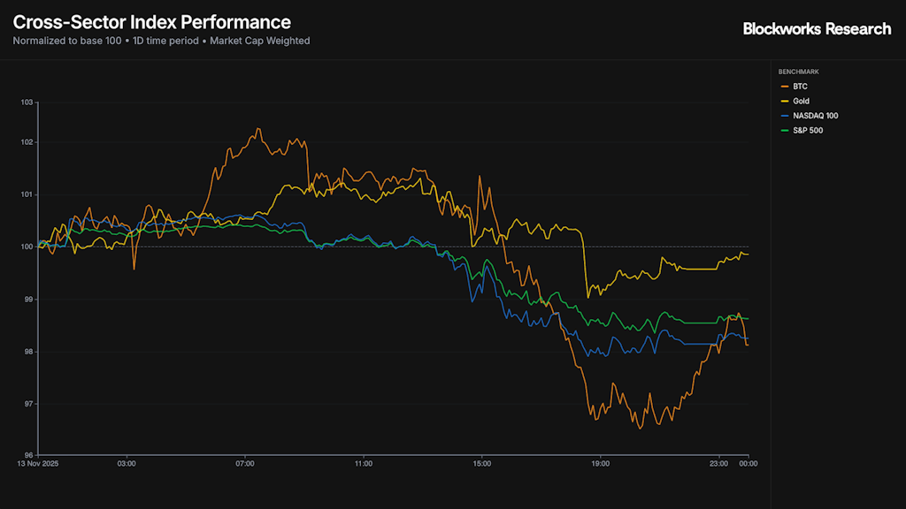 Risk assets sold off as doubts loom over a December rate cut, with BTC down -1.87% yesterday and tumbling briefly below $95,000 this morning, extending its losses. US equities also saw investors de-risk, with the Nasdaq and S&P 500 down -1.74% and -1.37%, respectively. Meanwhile, gold’s relative strength was notable, closing the day almost flat.