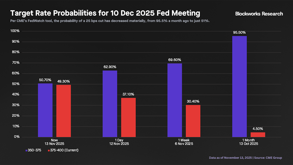Expanding on the macro side, Fed members are pushing back against a December cut, especially given the lack of new data on the jobs and inflation fronts due to the government shutdown. Minneapolis Fed President Neel Kashkari said yesterday he didn’t support the last interest rate cut, noting he’s undecided on the best course of action for next month’s policy meeting. The chart below effectively illustrates the sudden shift in market expectations. As of Nov. 13, the CME FedWatch Tool was pricing a 25 bps rate cut at just a 51% probability, compared to 63% the day before and over 95% a month ago.
