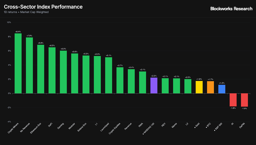 Back on the crypto side, most indices outperformed BTC, catching a bid after a tough month for risk assets. The best-performing index was Crypto Miners (+8.4%), with Cleanspark (CLSK) up more than 10% after JP Morgan raised its guidance for the company. Notably, the No Revenue index (+7.9%) was the second-best performer in the cohort, suggesting that investors’ risk appetite may be increasing as macro concerns ease.