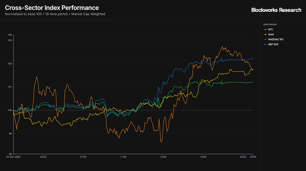 Markets bounced on Monday as odds swung back toward a potential December rate cut. Bitcoin climbed as much as 2.73%, briefly pushing above $89,000 before closing the day at $88,200 (+1.72%). The standout performer, however, was the Nasdaq 100 (+2.22%), posting its strongest daily gain since mid-May. The S&P 500 (+1.20%) also logged its best session in six weeks, while Gold (+1.75%) edged out BTC on the day, closing at its highest level since Nov. 14.