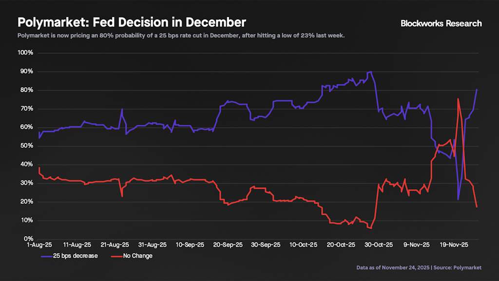 Markets bounced as December rate-cut odds swung back above 80%, lifting BTC, equities and gold.