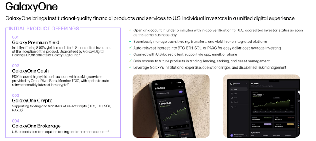 GalaxyOne is Galaxy’s consumer platform for US individual investors, bundling high yield cash, premium yield notes, and simple-crypto and US-equity trading in one app. If it scales, it can grow fee and spread income on client balances, provide cheaper and stickier funding for the trading and lending book, and create a direct funnel into Galaxy asset management and staking products. In big picture terms, it is a way for Galaxy to capture more of the economics of retail flows instead of relying only on institutional clients.