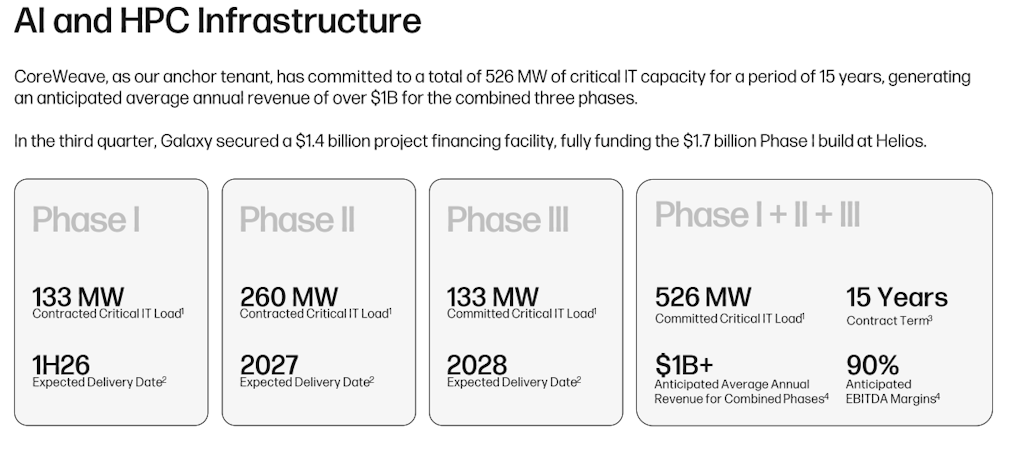 - The remaining 25% is tied to Data Centers, mainly the Helios build in Texas, which is effectively pre-revenue today but is expected to generate contracted rent from 2026 with CoreWeave its anchor tenant. Phase I targets delivery of 133 MW of contracted critical IT load by 1H26, with capacity rising to 526 MW when Phase III is completed in 2028.