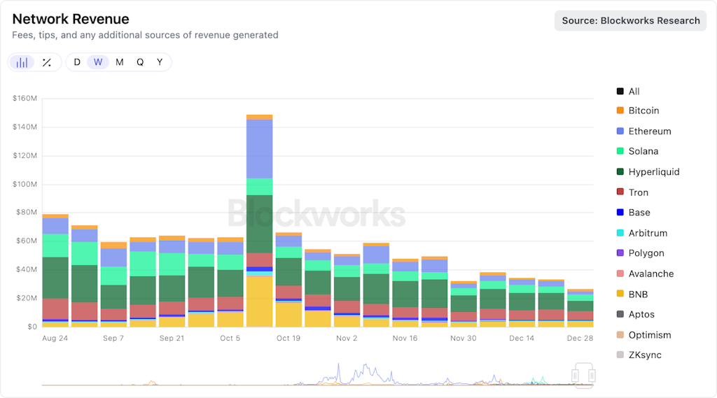 The downtrend in network revenues has continued, with total weekly revenue dropping 21% to $26.4 million, the lowest in at least a month. Hyperliquid saw the sharpest decline among major chains, falling 40% from $11.8 million to $7.1 million, while Ethereum dropped 38% to $2.2 million. Solana held up better, slipping just 2% to $4.7 million. Tron remained the top revenue generator after Hyperliquid at $6.1 million despite an 11% decline. The only notable gainers were smaller players: Arbitrum (+37%), Polygon (+50%), and BSC (+2%), though these moves represent relatively small absolute amounts.