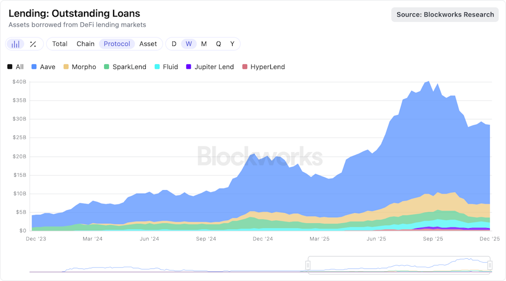 Outstanding loans tell a similar story. Aave holds $21.3 billion in loans, representing 74.7% of the market, a share that has remained relatively flat since January. The real movement has been among challengers: Morpho grew from 10.6% to 12.8% of outstanding loans, while Spark collapsed from 11.5% to just 4.7%. Fluid nearly doubled its share from 3.6% to 5.0%, and newer entrants Jupiter Lend (2.1%) and HyperLend (0.7%) have carved out small but growing positions.