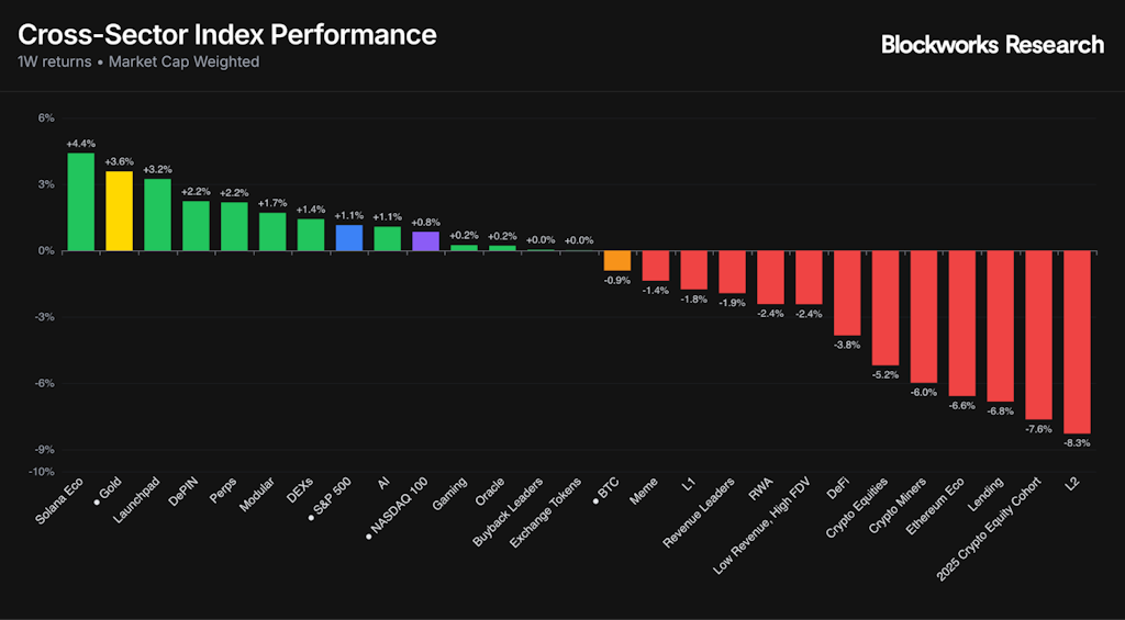Crypto sector indices showed mixed results over the week. On the upside, Solana Ecosystem (+4.4%) led gains, followed by Launchpads (+3.23%), DePIN (+2.23%), Perps (+2.17%), and Modular (+1.7%). DEXs (+1.42%) and AI (+1.07%) also posted modest advances. On the downside, L2s (-8.27%) and Lending (-6.82%) saw the steepest declines, with Ethereum Ecosystem (-6.57%) and Crypto Miners (-5.97%) also under pressure.