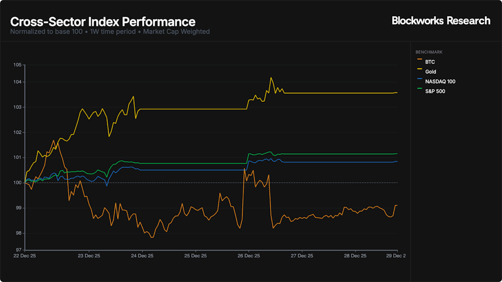 Benchmarks drifted up slowly over the past week: Gold led gains (+3.57%) while the S&P 500 (+1.15%) and Nasdaq 100 (+0.84%) also posted modest advances. BTC bucked the trend, slipping 0.90% despite the broader environment.