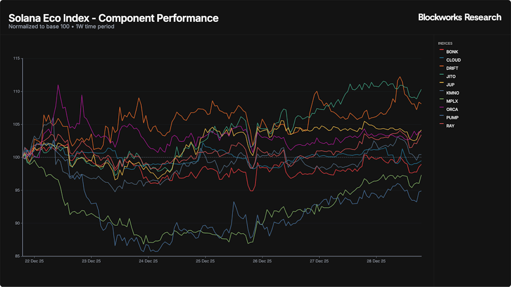 JTO led the Solana Eco index with a +10.30% move, followed closely by DRIFT (+8.10%) as liquid staking and perps narratives found renewed interest. JUP (+4.14%), ORCA (+3.81%), and RAY (+3.40%) also posted solid gains, reflecting strength across the DEX sector. On the lagging end, MPLX (-2.68%) struggled to find footing, and PUMP was the clear underperformer at -5.11%, continuing to bleed as memecoin-launchpad fatigue set in.