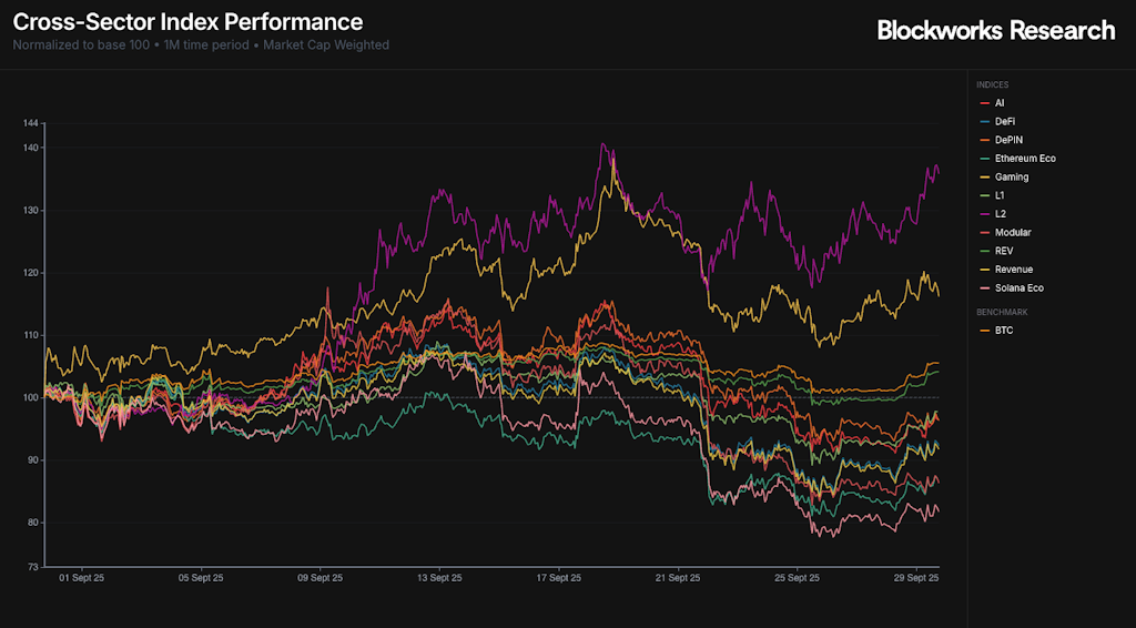 Zooming out to the monthly timeframe, L2s remain the notable winner. While most indices are down for September, L2s have notched a gain of 32%.