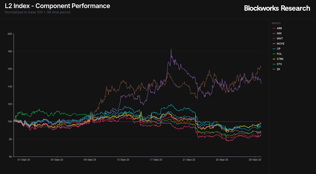 Under the surface, every L2 tracked in the index is down for September, except MNT and IMX, up 62% and 43%, respectively. While markets remain choppy and rangebound, pockets of alpha will continue to persist.