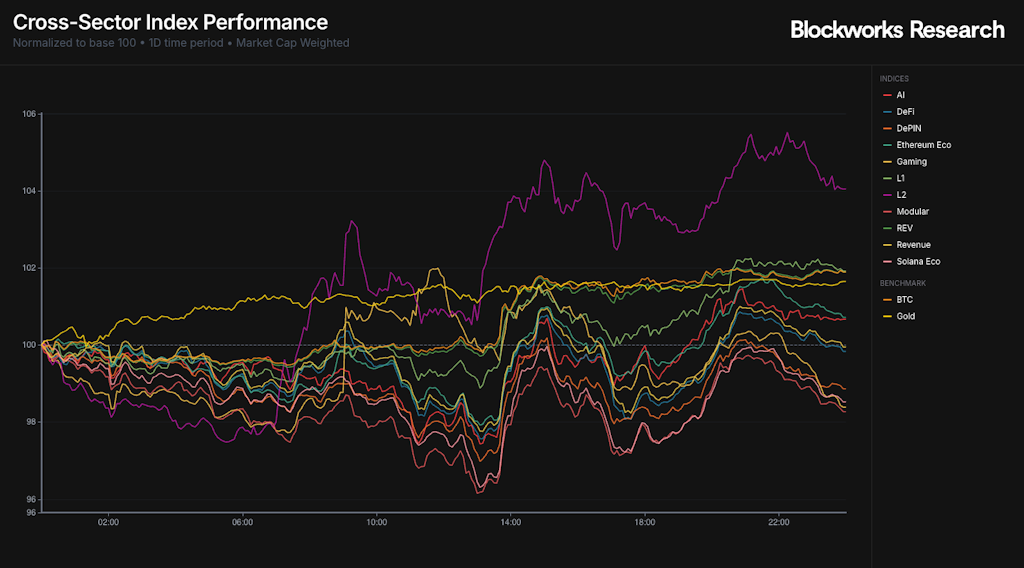 A rangebound market has found strength off the lows. The week opened green across the board, with both equity indices and crypto majors trading higher. BTC has moved up 5% from its recent low, and this strength is mirrored in ETH and SOL, each up 9% and 11% from their recent lows, respectively. L2s were the biggest winner on Monday’s session, while Modular and Gaming were the biggest losers on the day.