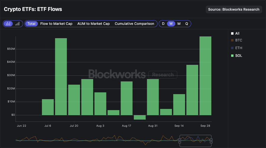 In contrast, and despite last week’s selloff, SOL ETFs posted their most positive week in net inflows since inception, registering +$59 million. This marks five consecutive weeks of net inflows for SOL ETFs. The pending approval of SOL ETFs under the ‘33 Act, likely to occur within the next few weeks, could likely accelerate this momentum. To reiterate, we view it as likely that SOL ETFs approved under the ‘33 Act can attract multiples more in AUM than what is already exhibited in the REX-Osprey SSK.